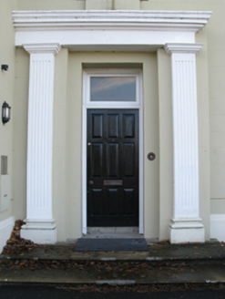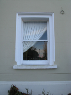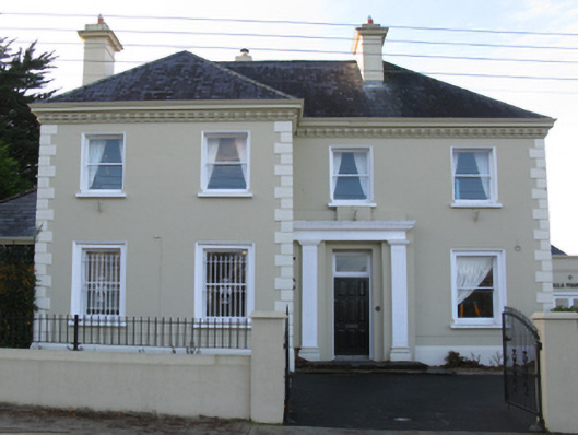 Detached four-bay (two-bay deep) two-storey bank, designed 1926; built 1926-7, on an L-shaped plan with two-bay full-height projecting end bay. Sold, 2006. Renovated, 2008, to accommodate alternative use. Hipped slate roof on an L-shaped plan with clay ridge tiles, rendered chimney stacks having cornices below capping supporting terracotta pots, and cast-iron rainwater goods on rendered stepped cornice having fluted consoles. Rendered, ruled and lined walls on moulded cushion course on rendered plinth with rusticated "sparrow pecked" quoins to corners. Square-headed off-central door opening with two steps, rendered doorcase with fluted pilasters supporting cornice on blind frieze, and concealed dressings framing timber panelled door having overlight. Square-headed window openings in square-headed recesses (ground floor) with concrete sills, and concealed dressings having bull nose-detailed reveals framing one-over-one timber sash windows behind wrought iron bars. Square-headed window openings (first floor) with concrete sills, and concealed dressings having bull nose-detailed reveals framing one-over-one timber sash windows. Set back from line of street.