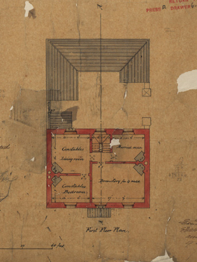 Detached three-bay two-storey constabulary barrack, designed 1873; built 1873-4; opened 1874, on a T-shaped plan centred on single-bay single-storey gabled advanced porch to ground floor. Occupied, 1901; 1911. Vacated, 1921. Leased, 1931. Now disused. Pitched slate roofs on collared timber construction including pitched (gabled) slate roof (porch), clay ridge tiles, red brick Running bond chimney stacks having chamfered capping supporting terracotta or yellow terracotta pots, and remains of cast-iron rainwater goods on exposed timber rafters retaining cast-iron downpipes. Roughcast walls. Camber-headed central door opening with overgrown threshold, and concealed red brick voussoirs framing remains of timber fittings. Square-headed window openings with drag edged dragged cut-limestone sills, and concealed red brick block-and-start surrounds framing six-over-six timber sash windows behind wrought iron bars. Set in unkempt grounds with rendered piers to perimeter supporting flat iron "farm gate".