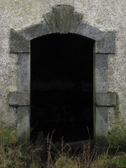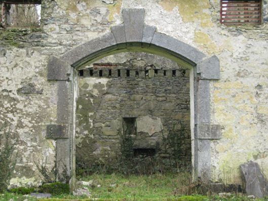 Farmyard complex, extant 1838, including (south): Attached five-bay single-storey coach house-cum-stable outbuilding with half-attic on a symmetrical plan originally detached. Now in ruins. Remains of pitched slate roof on timber construction with no rainwater goods surviving on cut-limestone eaves retaining cast-iron downpipes. Lime rendered or roughcast coursed rubble limestone walls with concealed tooled cut-limestone flush quoins to corners. Segmental-headed central carriageway with drag edged tooled cut-limestone block-and-start surround centred on triple keystone. Camber-headed flanking door openings with drag edged tooled cut-limestone block-and-start surrounds centred on triple keystones. Square-headed window openings with drag edged dragged cut-limestone sills (ground floor), and concealed dressings framing eight-over-eight timber sash windows (ground floor) or louvered timber fittings (half-attic). Interior in ruins. Set in unkempt grounds shared with Clogher House.