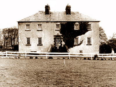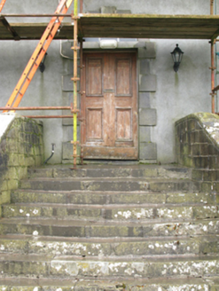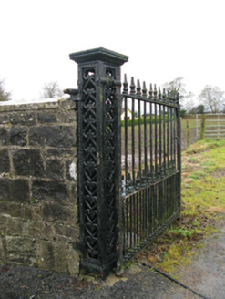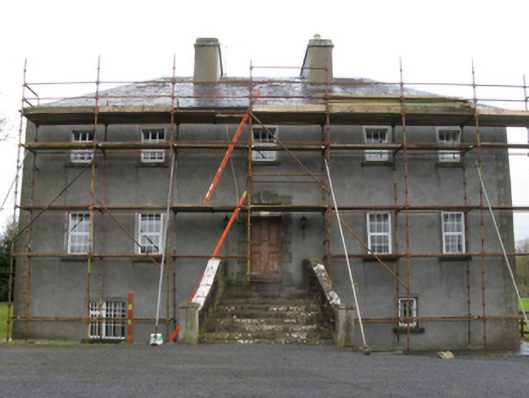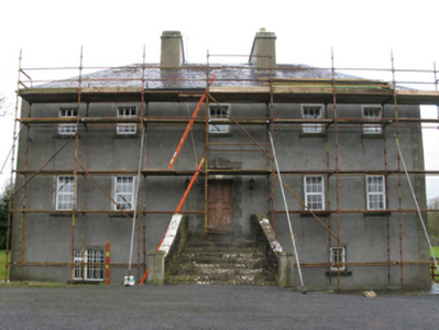 Detached five-bay two-storey over part raised basement farmhouse, built 1740, on a symmetrical plan with single-bay full-height side elevations. Vacant, 1901. Occupied, 1911. Renovated, ----. Hipped slate roof with pressed iron ridges, paired cement rendered central chimney stacks having cut-limestone stringcourses below capping supporting yellow terracotta tapered pots, and replacement uPVC rainwater goods on cut-limestone eaves retaining some cast-iron downpipes. Replacement cement rendered walls on battered base with rendered quoins to corners. Square-headed central door opening approached by flight of nine repointed cut-limestone steps with cut-limestone block-and-start surround centred on triple keystone framing timber panelled door having overlight. Square-headed window openings (basement) with cut-limestone sills, and rendered "bas-relief" surrounds framing replacement uPVC casement windows behind cast-iron bars. Square-headed window openings with cut-limestone sills, and rendered "bas-relief" surrounds framing replacement uPVC casement windows replacing six-over-six (ground floor) or six-over-three (first floor) timber sash windows having part exposed sash boxes. Interior including (ground floor): central hall on a square plan retaining carved timber lugged surrounds to door openings framing timber panelled doors; staircase hall (west) on a square plan; reception room (south) retaining carved timber surround to door opening framing timber panelled door with carved timber surrounds to window openings framing timber panelled shutters; reception room (north) retaining carved timber surround to door opening framing timber panelled door with carved timber surrounds to window openings framing timber panelled shutters; and carved timber surrounds to door openings to remainder framing timber panelled doors with carved timber surrounds to window openings framing timber panelled shutters. Set in landscaped grounds with cast-iron piers to perimeter having capping supporting spear head-detailed cast-iron double gates.