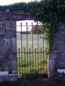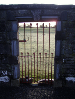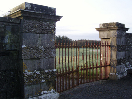 Gateway, extant 1894, on a symmetrical plan comprising pair of vermiculated-banded drag edged dragged limestone ashlar piers on moulded cushion courses on plinths having "Cavetto"-detailed cornices below capping supporting spear head-detailed cast-iron double gates with vermiculated-banded drag edged dragged limestone ashlar outer piers on moulded cushion courses on benchmark-inscribed plinths having monolithic stringcourses below capping. Now disused. Road fronted on a corner site at entrance to grounds of Towerhill House.