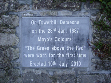 A gateway not only making a pleasing visual statement in a sylvan street scene at the principal entrance on to the grounds of the Towerhill House estate, but also illustrating the continued development or "improvement" of the estate in the later nineteenth century: meanwhile, a benchmark remains of additional interest for the connections with cartography and the preparation of maps by the Ordnance Survey (established 1824). NOTE: A recent plaque (2010) records that 'on Towerhill Demesne on the 23rd Jan. 1887 Mayo's Colours "The Green above the Red" were worn for the first time'.
