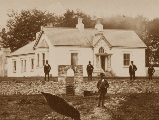 Detached three-bay single-storey farmhouse, extant 1873, on a T-shaped plan centred on single-bay single-storey gabled "bas-relief" breakfront with single-bay (three-bay deep) single-storey central return (south). Sold, 1897. Occupied, 1911. Reroofed. Replacement pitched slate roof on a T-shaped plan centred on pitched (gabled) slate roof with hipped slate roof (south), ridge tiles, paired cement rendered central chimney stacks having chamfered capping supporting yellow terracotta octagonal or tapered pots, and uPVC rainwater goods on box eaves. Creeper- or ivy-covered rendered walls. Bisected Tudor-headed central door opening approached by flight of five steps, concealed dressings with crow stepped hood moulding over framing timber panelled door having overlight. Square-headed window openings with cut-limestone sills, and concealed dressings having chamfered reveals with hood mouldings over framing two-over-two timber sash windows. Interior including central entrance hall retaining carved timber surrounds to door openings framing timber panelled doors; and carved timber surrounds to door openings to remainder framing timber panelled doors with timber panelled shutters to window openings. Set in unkempt landscaped grounds including "haha".