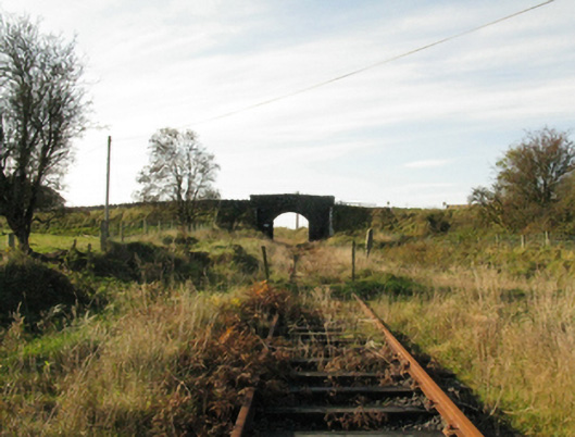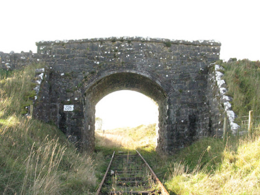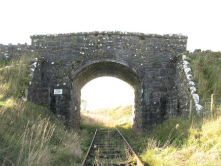 Single-arch road bridge over railway line, extant 1894; opened 1895. Tuck pointed snecked rock faced limestone walls between tuck pointed snecked rock faced limestone battered abutment walls with lichen-covered rock faced cut-limestone coping to parapets. Single segmental arch with red brick header bond voussoirs. Sited spanning overgrown railway line with unkempt embankments to railway line.