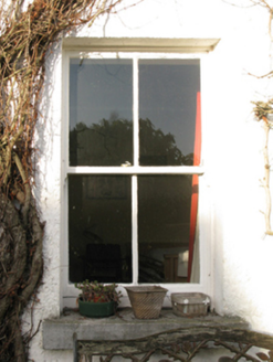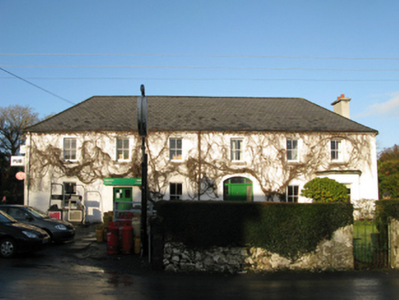 Detached six-bay two-storey hotel, extant 1911, on a rectangular plan originally five-bay two-storey on a symmetrical plan. Extended, post-1918, producing present composition. Reroofed, ----. Replacement hipped artificial slate roof with clay ridge tiles, and uPVC rainwater goods on timber eaves boards on rendered eaves retaining some cast-iron downpipes. Creeper- or ivy-covered lime rendered or roughcast wall to front (east) elevation; cement rendered surface finish (remainder). Hipped segmental-headed central door opening in segmental-headed recess with concealed dressings framing timber panelled door having sidelights on diamond pointed panelled risers below overlight. Square-headed window openings with drag edged dragged cut-limestone sills, and concealed dressings framing two-over-two timber sash windows. Set in landscaped grounds on a corner site with limewashed piers to perimeter having overgrown capping supporting wrought iron gate.