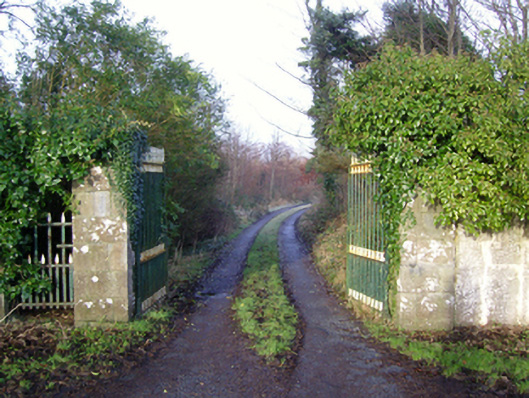 Gateway, extant 1894, on a symmetrical plan comprising pair of drag edged rock faced limestone ashlar piers having ivy-covered pyramidal capping supporting cast-iron double gates. Road fronted on a corner site at entrance to grounds of Cloonee House.