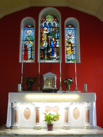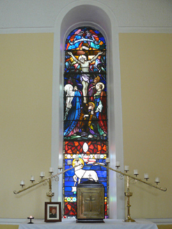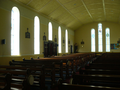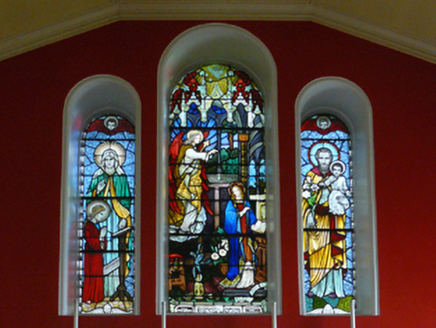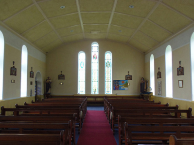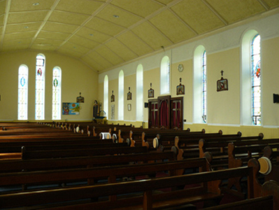 A church erected to designs attributable to Edward Raphael Ryan (fl. 1933-64) of Galway representing an integral component of the mid twentieth-century ecclesiastical heritage of south County Mayo with the architectural value of the composition, one recalling the similarly restructured Saint Patrick's Catholic Church (1952), Aghagower (see 31308809); and Saint Mary's Catholic Church (1950-1), Tuar Mhic Éadaigh [Toormakeady] (see 31310904), suggested by such attributes as the cruciform plan form, aligned along a skewed liturgically-correct axis; the slender profile of the openings underpinning a streamlined Romanesque theme with the chancel defined by an elegant "Trinity Window"; and the bellcote embellishing the roofline as a picturesque eye-catcher in the landscape. Having been well maintained, the form and massing survive intact together with substantial quantities of the original fabric, both to the exterior and to the vaulted interior where contemporary joinery; stained glass once again recalling Aghagower and Tuar Mhic Éadaigh [Toormakeady]; and the vibrant Corcoran Memorial "Trinity Window" (----), all highlight the artistic potential of a church making a pleasing visual statement in a sylvan street scene.