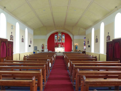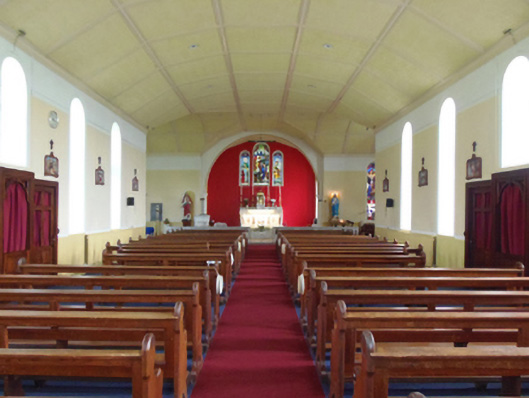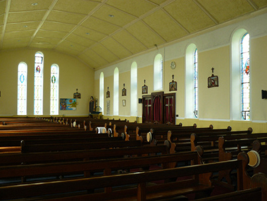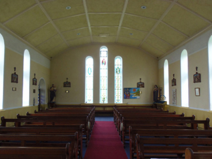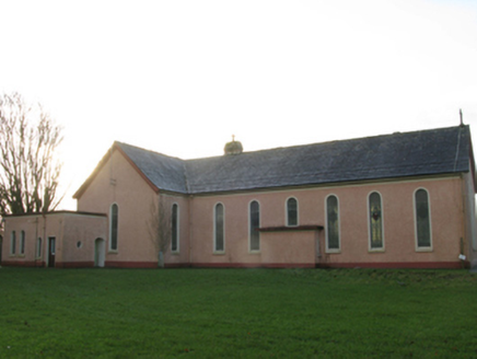 Detached eight-bay double-height Catholic church, built 1952, on a cruciform plan comprising six-bay double-height nave opening into single-bay (single-bay deep) double-height transepts centred on single-bay double-height chancel to crossing (east). Pitched slate roof on a cruciform plan, clay ridge tiles with lichen-covered Celtic Cross finials to apexes, slightly sprocketed eaves, and replacement uPVC rainwater goods on timber eaves boards on box eaves retaining cast-iron octagonal hoppers and downpipes. Roughcast walls on rendered plinth with rendered band to eaves. Round-headed window openings with concrete sills, and rendered surrounds having chamfered reveals framing storm glazing over fixed-pane fittings having stained glass margins centred on leaded stained glass "lozenges". Round-headed "Trinity Window" (east) with concrete sill, and concealed dressings framing storm glazing over fixed-pane fittings having stained glass margins centred on leaded stained glass panels. Round-headed window openings ("cheeks") with concrete sills, and rendered surrounds having chamfered reveals framing storm glazing over fixed-pane fittings having stained glass margins centred on leaded stained glass "lozenges". Round-headed "Trinity Window" to entrance (west) front with concrete sills, and rendered surrounds having chamfered reveals framing storm glazing over fixed-pane fittings having stained glass margins centred on leaded stained glass "lozenges". Full-height interior with stained glass memorial "Trinity Window" (----), carpeted central aisle between timber pews, stained glass memorial windows (----) centred on timber panelled confessionals, and herring bone-pattern timber parquet stepped dais to sanctuary to crossing (east) retaining arcaded communion railings with round-headed chancel arch framing cut-veined white marble stepped "predella" supporting pierced quatrefoil-panelled altar below stained glass memorial "Trinity Window" (----). Set in landscaped grounds.