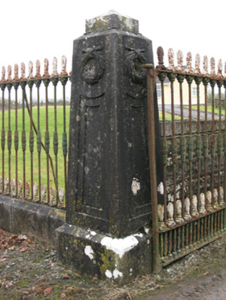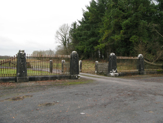 Gateway, extant 1838[?], on a symmetrical plan comprising pair of garland-detailed tooled cut-limestone panelled "obelisk" piers on chamfered plinths having lichen-covered pyramidal capping with garland-detailed tooled cut-limestone panelled "obelisk" outer piers on benchmark-inscribed chamfered plinths having lichen-covered pyramidal capping supporting cast-iron railings. Repositioned, post-1918. Road fronted at entrance to grounds of Clooncormick House.
