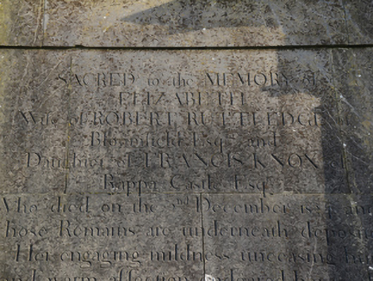 A Sir William Chambers (1723-96)-esque mausoleum or monument erected 'to the MEMORY of ELIZABETH [Ruttledge (1768-1824)] Wife of ROBERT RUTTLEDGE of Bloomfield Esqr. and Daughter of FRANCIS KNOX of Rappa Castle Esqr.' contributing positively to the group and setting values of the Church of Saint Charles the Martyr (Kilcommon).