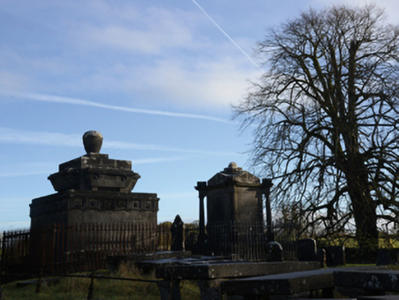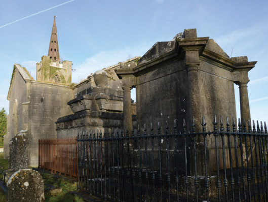 Freestanding limestone ashlar funerary mausoleum or monument, dated 1824, on a square plan on cut-limestone stepped base. Set in unkempt grounds shared with Church of Saint Charles the Martyr (Kilcommon) with spear head-detailed cast-iron railings to perimeter.