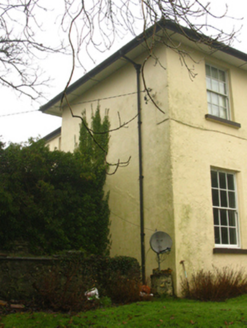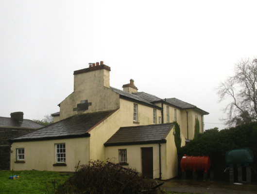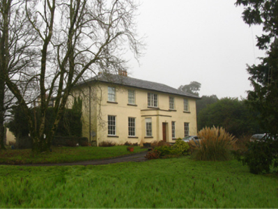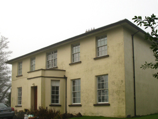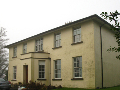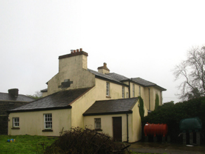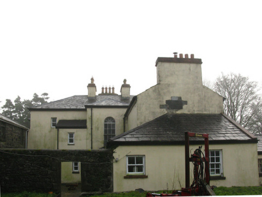 Detached five-bay two-storey double-pile farmhouse, extant 1786, on a cruciform plan centred on single-bay single-storey flat-roofed projecting porch to ground floor on an elliptical bowed plan with single-bay (single-bay deep) full-height central return (north-west). "Improved", pre-1893, producing present composition. Vacant, 1901. Occupied, 1911. Refenestrated. Hipped slate roofs on a T-shaped plan centred on hipped slate roof (north-west) with pressed or rolled iron ridges, paired rendered central chimney stacks centred on rendered chimney stack on axis with ridge having cut-limestone stringcourses below chamfered capping supporting terracotta or yellow terracotta tapered octagonal pots, and cast-iron rainwater goods on eaves boards on overhanging eaves retaining cast-iron octagonal or ogee hoppers and downpipes. Part creeper- or ivy-covered rendered, ruled and lined walls. Square-headed central door opening approached by flight of four lichen-covered cut-limestone steps with concealed dressings framing replacement timber panelled door. Square-headed flanking window openings with cut-limestone sills, and concealed dressings framing replacement four-over-four timber sash windows having overpanels. Square-headed window openings centred on square-headed window opening in tripartite arrangement (first floor) with square-headed window openings to rear (north-west) elevation centred on round-headed window opening (half-landing), cut-limestone sills, and concealed dressings framing replacement six-over-six timber sash windows centred on two-over-two timber sash window having four-over-four sidelights with one-over-one timber sash windows to rear (north-west) elevation centred on six-over-six timber sash window having fanlight. Interior including (ground floor): vestibule with timber panelled shutters to window openings; door opening into entrance hall with timber panelled double doors having overlight; entrance hall retaining carved timber surrounds to door openings framing timber panelled doors; and carved timber surrounds to door openings to remainder framing timber panelled doors with timber panelled shutters to window openings. Set in landscaped grounds including "haha".
