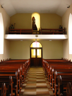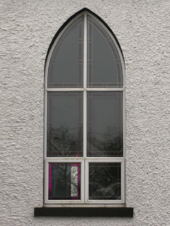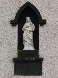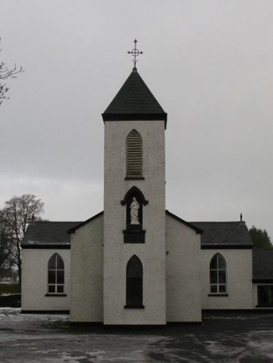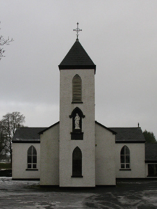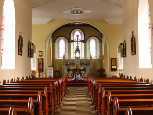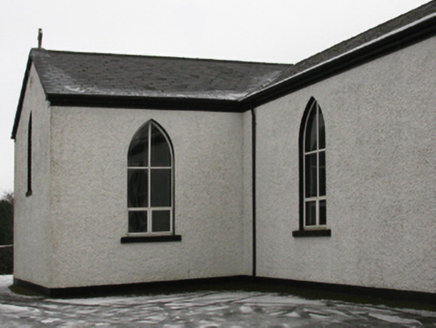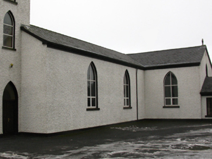 Detached four-bay double-height Catholic church, built 1826-7; dated 1827; extant 1838, on a cruciform plan comprising two-bay double-height nave opening into single-bay (single-bay deep) double-height transepts centred on single-bay double-height chancel to crossing (east) with single-bay three-stage tower to entrance (west) front on a square plan. "Improved", 1898, producing present composition. Extensively renovated, 1988, with sanctuary reordered. Replacement pitched artificial slate roof on a cruciform plan with ridge tiles terminating in cut-limestone Celtic Cross finials to apexes, and uPVC rainwater goods on timber eaves boards on rendered eaves. Roughcast walls on rendered plinth. Pointed-arch window openings with concrete sills, and concealed dressings framing replacement fixed-pane uPVC fittings having stained glass margins. Lancet "Trinity Window" to chancel (east) with concrete sills, and concealed dressings framing storm glazing over fixed-pane fittings having stained glass margins centred on lattice glazing bars. Lancet window opening to tower (first stage) with concrete sill, and concealed dressings framing storm glazing over fixed-pane fitting having stained glass margins centred on square leaded glazing bars. Pointed-arch opposing door openings to "cheeks" with concealed dressings framing replacement timber panelled double doors having overlights. Lancet window openings (second stage) centred on lancet niche on rope twist-detailed drag edged cut-limestone date stone ("1827") with concrete sills, and concealed dressings framing replacement fixed-pane uPVC fittings having stained glass margins. Lancet openings (bell stage) with concrete sills, and concealed dressings framing louvered timber fittings. Interior including vestibule (west); round-headed door opening into nave with glazed timber panelled double doors having overlight; full-height interior with carpet tiled central aisle between timber pews, paired Gothic-style timber stations, carpeted stepped dais to sanctuary to crossing (east) reordered, 1988, with segmental-headed chancel arch framing cut-veined white marble Gothic-style reredos below "Trinity Window", and vaulted timber boarded ceiling in carved timber frame on carved timber cornice. Set in relandscaped grounds.