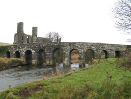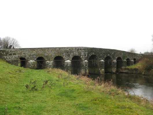Nine-arch hump back road bridge over river, extant 1838. Part ivy-covered walls centred on triangular cutwaters to piers to upriver (east) elevation having pyramidal capping with lichen-covered "saddleback" coping to parapets. Series of nine round or segmental arches between cast-iron "Pattress" tie plates with repointed voussoirs. Sited spanning Dalgan River with unkempt grass banks to river.