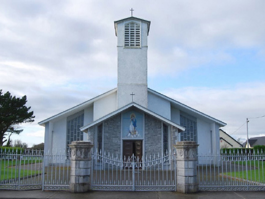 A gateway reclaimed from the Bloomfield House estate making a pleasing visual statement in a rural village street scene at the entrance on to the grounds of the architecturally-undistinguished Catholic Church of the Immaculate Conception. NOTE: An identical gateway was similarly repurposed (1952) at the Catholic Church of Our Lady of Sorrows (1952) in Robeen (see 31311012).