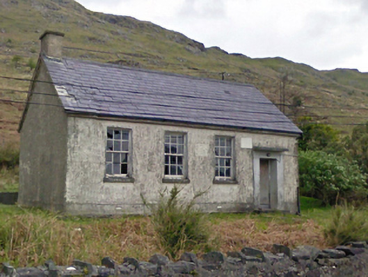 A dishevelled national school erected to a standardised design for the Commissioners of National Education in Ireland (cf. 31301202) representing an integral component of the late nineteenth-century architectural heritage of Contae Mhaigh Eo [south County Mayo]. A prolonged period of neglect notwithstanding, the elementary form and massing survive intact together with substantial quantities of the original fabric, thereby upholding the character or integrity of a national school making a pleasing visual statement in a mountainous setting overlooking Loch Measca [Lough Mask].