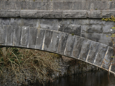 Single-arch road bridge over canal, extant 1859. Part creeper- or ivy-covered tuck pointed snecked rock faced limestone walls between drag edged rock faced limestone ashlar battered piers with drag edged rock faced cut-limestone chamfered stringcourses supporting benchmark-inscribed drag edged tooled limestone ashlar parapets. Single segmental arch with drag edged rock faced limestone ashlar voussoirs. Sited spanning Cong Canal with unkempt banks to canal.