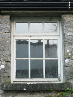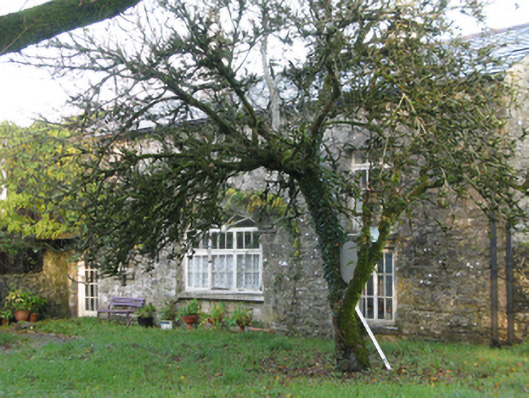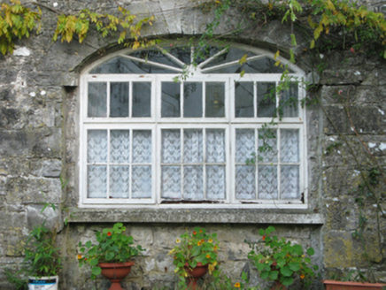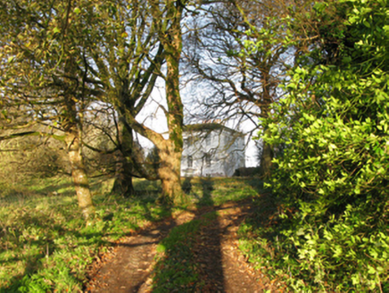 Detached three-bay two-storey over raised basement Board of First Fruits Church of Ireland glebe house, built 1817, on a symmetrical plan. Occupied, 1901; 1911. Partly reconstructed, 1963, producing present composition. Renovated, ----. Now disused. Hipped slate roof with lichen-covered clay ridge tiles, rendered central "wallhead" chimney stack to rear (north) elevation having stepped capping supporting terracotta octagonal pots, and replacement uPVC rainwater goods on eaves boards on cut-limestone eaves retaining some cast-iron octagonal hoppers and downpipes. Replacement cement rendered walls. Square-headed window openings centred on segmental-headed door opening originally approached by flight of steps with replacement concrete sills, and concealed dressings framing replacement uPVC casement windows centred on replacement uPVC casement window having fanlight. Set in landscaped grounds with lichen-covered cut-limestone monolithic piers to perimeter supporting looped wrought iron double gates.