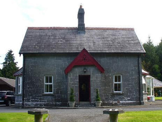 Detached three-bay single-storey game keeper's house with half-dormer attic, built 1862; extant 1894, on a T-shaped plan centred on single-bay single-storey gabled projecting porch to ground floor. Renovated, ----, to accommodate continued alternative use. Pitched slate roof on a T-shaped plan centred on pitched (gabled) slate roof with trefoil-perforated crested terracotta ridge tiles centred on tuck pointed snecked limestone chimney stack on chamfered base having cut-limestone capping supporting crested terracotta pots, decorative timber bargeboards to gables on timber purlins, and replacement uPVC rainwater goods on exposed timber rafters retaining cast-iron downpipes. Part creeper- or ivy-covered tuck pointed snecked limestone walls on lichen-covered cut-limestone chamfered plinth with drag edged dragged cut-limestone flush quoins to corners. Square-headed central door opening with cut-limestone threshold, and drag edged dragged cut-limestone lintel framing timber panelled door. Square-headed flanking window openings with drag edged dragged cut-limestone sills, and drag edged dragged cut-limestone block-and-start surrounds framing replacement uPVC casement windows replacing two-over-two timber sash windows. Set back from road in landscaped grounds.