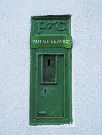 Wall-mounted cast-iron "wall box" post box, between 1939-62, with "P7T [Posts and Telegraphs]" monogram. Now disused. Set in rendered boundary wall.