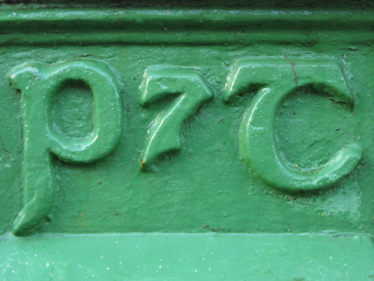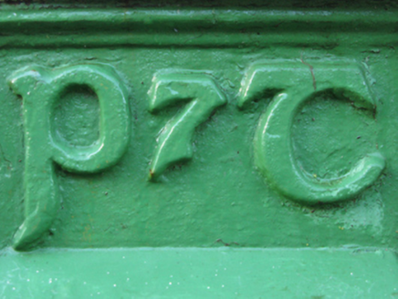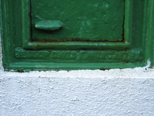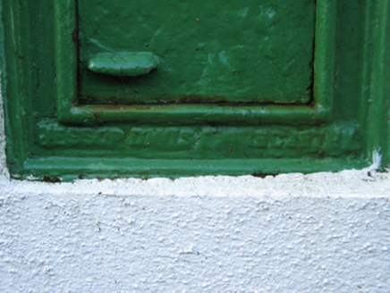 A "wall box" post box supplied by [Thomas] Jessop Davis (closed 1962) of Enniscorthy, County Wexford, also known as Saint John's Ironworks and Foundry, representing an interesting example of mass-produced cast-iron work making a pleasing, if largely inconspicuous visual statement in a rural street scene with embellishments identifying the artistic potential of the composition including the Cló Gaelach or "Old Irish Lettering" defining the monogram of the Department of Posts and Telegraphs (fl. 1924-84).