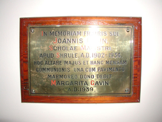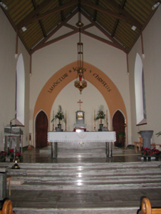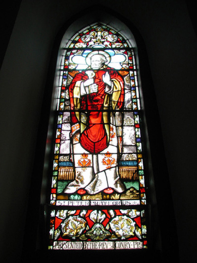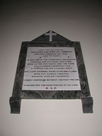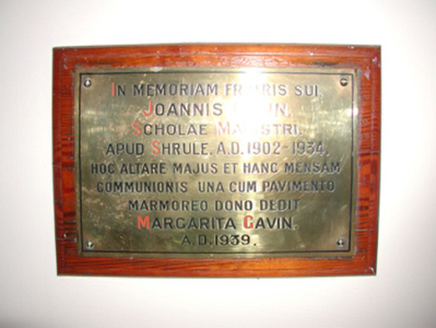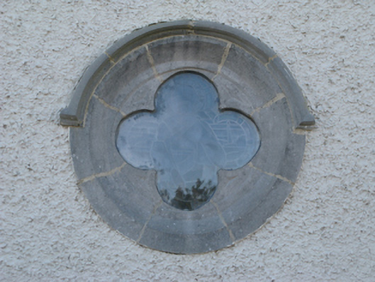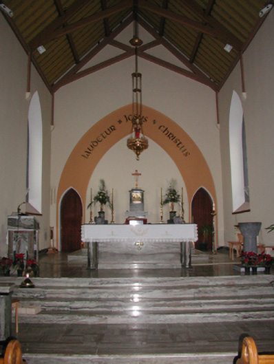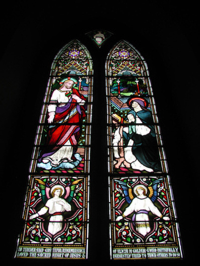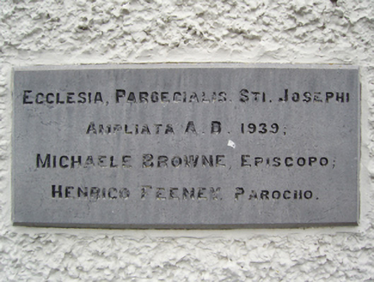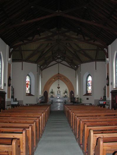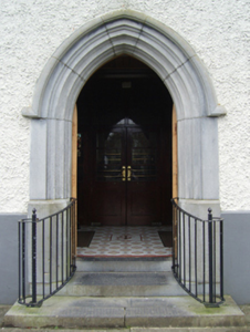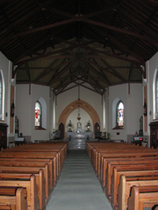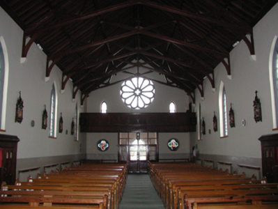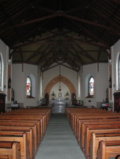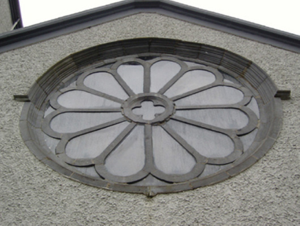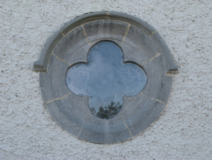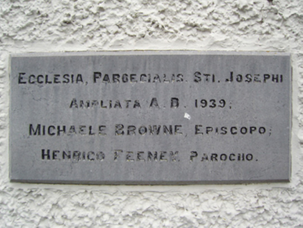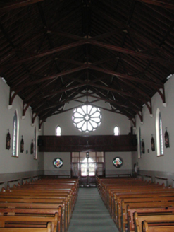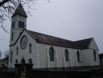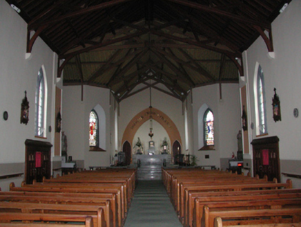 Detached five-bay double-height Catholic church, begun 1938; completed 1939; dated 1939; dedicated 1939, on a cruciform plan comprising three-bay double-height nave opening into single-bay (single-bay deep) double-height transepts centred on single-bay double-height chancel to crossing (west) with single-bay three-stage tower (south-east) on a square plan. Pitched slate roof on a cruciform plan with lichen-covered clay ridge tiles, concrete coping to gables including concrete coping to gable to entrance (east) front with Celtic Cross finial to apex, and replacement uPVC rainwater goods on rendered cut-limestone eaves. Roughcast walls on rendered chamfered plinth with rendered stepped buttresses having rendered coping. Pointed-arch window openings with concrete sills, Y-mullions, and concrete surrounds having chamfered reveals with hood mouldings over framing storm glazing over fixed-pane fittings having stained glass margins centred on square leaded glazed bars. Pointed-arch window openings to transepts with Y-mullions, and drag edged dragged cut-limestone surrounds having chamfered reveals framing storm glazing over fixed-pane fittings having stained glass margins centred on leaded stained glass panels. Lancet window openings to crossing (west), drag edged dragged cut-limestone surrounds having chamfered reveals with hood mouldings over framing storm glazing over fixed-pane fittings having stained glass margins centred on leaded stained glass panels. Pointed-arch door opening to entrance (east) front approached by two dragged cut-limestone steps between wrought iron railings, dragged cut-limestone surround having stepped rebated reveals with hood moulding over framing timber boarded or tongue-and-groove timber panelled double doors. Quatrefoil flanking window openings, dragged cut-limestone surrounds having chamfered reveals with hood mouldings over framing storm glazing over fixed-pane fittings having stained glass margins centred on leaded stained glass panels. Multifoil "Rose Window" to gable, dragged cut-limestone surround having stepped reveals with hood moulding over framing storm glazing over fixed-pane fittings. Lancet flanking window openings, drag edged tooled cut-limestone surrounds having chamfered reveals with hood mouldings over framing storm glazing over fixed-pane fittings having stained glass margins centred on square leaded glazing bars. Interior including vestibule (east) with mosaic tiled floor; square-headed door opening into nave with glazed timber panelled double doors having sidelights on panelled risers below overlight; full-height interior open into roof with timber panelled choir gallery (east) below "Rose Window", carpeted central aisle between cruciform-detailed timber pews, paired Gothic-style timber stations between stained glass memorial windows (undated) with stained glass memorial windows (undated) to transepts, cut-veined white marble Classical-style wall monument (ob. 1885) to transept (south) with cut-veined white marble wall monument (ob. 1864) to transept (north), pair of stained glass memorial windows (undated) centred on cut-veined grey marble stepped dais to sanctuary to crossing (west) with stepped "predella" supporting cruciform-detailed cut-veined grey marble altar, and exposed scissor truss timber roof construction on beaded corbels with wind braced rafters to diagonal timber boarded ceiling on carved timber cornice. Set in own grounds with rendered panelled piers to perimeter having "Cyma Recta" or "Cyma Reversa" stringcourses below shallow pyramidal capping supporting "Fleur-de-Lys"-detailed mild steel gate.