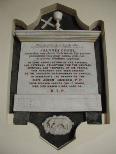 A church reconstructed under the aegis of Reverend Henry "Harry" Feeney PP (1889-1945; fl. 1931-45), and to a design (1938) by Edward Raphael Ryan (fl. 1933-64) of Galway (IAA), representing an integral component of the twentieth-century ecclesiastical heritage of south County Mayo with the architectural value of the composition, one abutting a chapel erected (1830) with financial support from Patrick Kirwan (d. 1854) of nearby Dalganpark, 'a neat edifice in the ancient English style with a square tower' (Lewis 1837 II, 555), confirmed by such attributes as the cruciform plan form, aligned along an inverted liturgically-correct axis; the "pointed" profile of the openings underpinning a streamlined Georgian Gothic theme; and the pyramid-topped monolithic tower embellishing the roofline as a familiar eye-catcher in the landscape. Having been well maintained, the elementary form and massing survive intact together with substantial quantities of the historic or original fabric, both to the exterior and to the interior where contemporary joinery; vibrant stained glass including the Conroy Memorial Windows; and Classical wall monuments dedicated to Reverend John Goode PP (d. 1885) and Richard Golding (d. 1864) of nearby Shrule House (see 31312212), all highlight the artistic potential of the composition: meanwhile, an exposed timber roof construction pinpoints the engineering or technical dexterity of a church making a pleasing visual statement in a rural village setting.