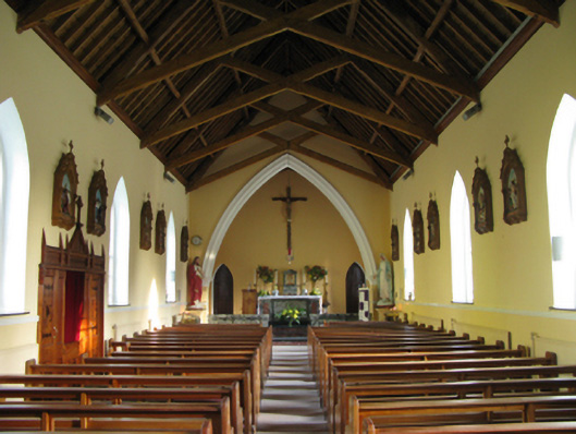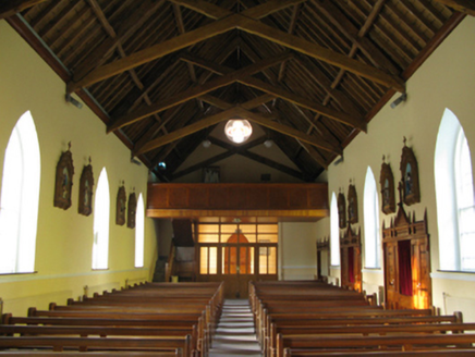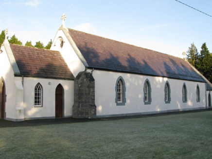 Detached five-bay double-height single-cell Catholic church, built 1873-5; dated 1875; dedicated 1876; extant 1894, originally four-bay double-height[?] with single-bay single-storey gabled projecting porch to entrance (west) front. "Improved", 1944, producing present composition. Pitched slate roofs including pitched (gabled) slate roof to porch with clay ridge tiles, concrete[?] coping to gables on kneelers with Celtic Cross finials to apexes, and replacement uPVC rainwater goods on timber eaves boards retaining cast-iron downpipes. Rendered walls on rendered chamfered plinth with stepped buttresses to corners including tuck pointed drag edged rock faced cut-limestone clasping stepped buttresses to corners to entrance (west) front having drag edged tooled cut-limestone "slated" coping. Pointed-arch window openings with drag edged tooled cut-limestone block-and-start surrounds framing two-over-four timber sash windows having margins. Quatrefoil "Rose Window" to gable to entrance (west) front, concealed dressings with hood moulding over framing fixed-pane fitting having stained glass margins centred on leaded stained glass panel. Pointed-arch door opening with drag edged tooled cut-limestone block-and-start surround having chamfered reveals framing timber boarded or tongue-and-groove timber panelled double doors. Pointed-arch window openings to "cheeks" with concealed dressings framing fixed-pane timber fittings having margins. Interior including vestibule (west); square-headed door opening into nave with glazed timber panelled double doors having sidelights on panelled risers below overlight; full-height interior open into roof with timber panelled choir gallery (west) below stained glass "Rose Window", carpeted central aisle between timber pews, paired Gothic-style timber stations, exposed scissor truss timber roof construction with wind braced rafters to timber boarded ceiling, and pointed-arch chancel arch framing stepped dais to sanctuary (east) with arcaded communion railings centred on stepped "predella" supporting cut-veined Connemara marble panelled altar. Set in landscaped grounds.
