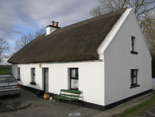 Detached four-bay single-storey direct entry thatched house with dormer attic, extant 1894. Renovated, 2002. Pitched roof with part chicken wire-covered replacement Turkish reed thatch, exposed hazel or sally lattice stretchers to ridge having exposed scallops, cement rendered dwarf chimney stack having corbelled stepped stringcourse below capping supporting terracotta pots, and concrete coping to gables. Replacement cement rendered battered walls on rendered plinth. Square-headed window openings with concrete sills, and concealed dressings framing replacement timber casement windows. Square-headed opposing door openings with concealed dressings framing replacement glazed timber boarded or tongue-and-groove timber panelled doors. Interior including kitchen retaining hearth with tooled cut-limestone surround centred on tooled cut-limestone keystone, timber boarded opposing loft ladder with timber balusters supporting timber banister terminating in turned timber newels, and timber boarded vaulted ceiling; parlour (west) retaining timber chimneypiece, and timber boarded ceiling in carved timber frame; and loft bedroom (east) with timber boarded vaulted ceiling. Set perpendicular to road.