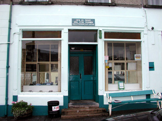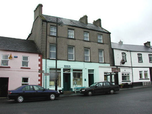 Detached four-bay three-storey house, built c.1880, comprising post office to ground floor. Return and extension to rear, now abutting two-storey house to east and west. Pitched slate roof with rendered chimneystacks. Pebbledashed façade with quoins and sill course and render to gables and rear. Shopfront comprises two large display windows with centrally placed door approached by a number of stone steps. Stucco fascia panel. Timber sash windows with stucco surrounds. Timber panelled door with overlight, serving passageway and upper floors. Two outbuildings to rear comprising two-storey rendered outbuilding with slate roof and a single-storey outbuilding with corrugated-iron roof. Wrought-iron gate to north-east of house. Sandstone flags to passageway and to shop floor. Wainscoting to interior with timber panelled counters. Building fronts onto street.