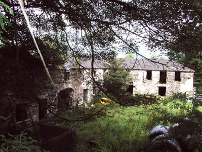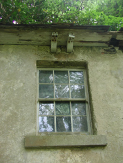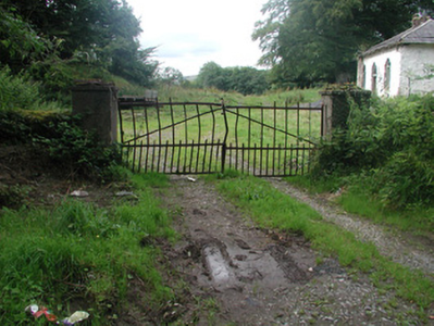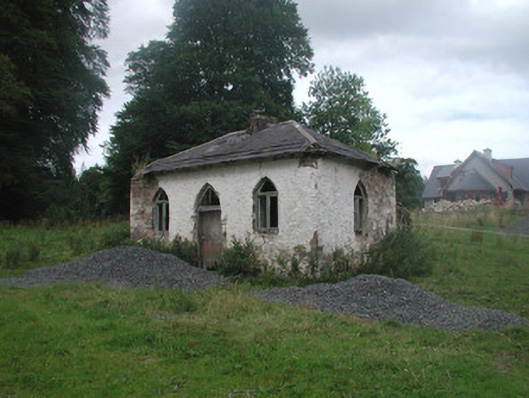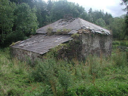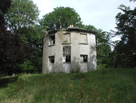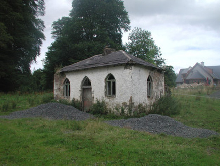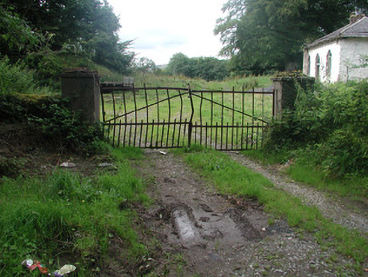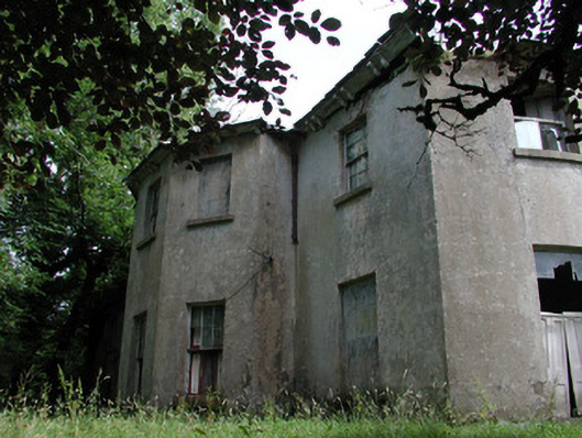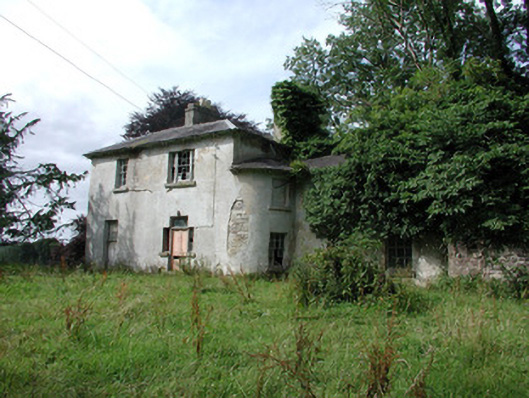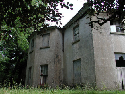 Detached four-bay two-storey country house, built c.1820, now derelict. Comprising bow-ended western gable and full-height canted bay to north elevation. Two-bay two-storey side return with half bow on south side connecting to main house. Pitched slate roof with oversailing eaves and brackets, concrete chimneystacks and terracotta pots. Ruled-and-lined render to random coursed stone walls. Timber sash and Wyatt windows with limestone sills. Some interior shutters remain. Timber panelled door with sidelights and square-headed overlight. Farmyard located to east of house at lower level. Range of outbuildings around yard with L-plan seven-bay two-storey main building having hipped slate roof. Sandstone and limestone walls and integral carriage arches. Detached gate lodge to east of house, now derelict. Comprising three-bay single-storey with hipped slate roof and stone chimneystack. Timber corbels to eaves and lean-to. Limewashed walls. Pointed-arched openings with timber casement windows and timber battened door. Ruled-and-lined render to gate pier to south of lodge with wrought-iron gates.