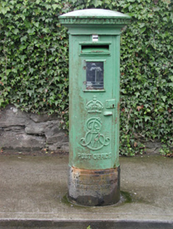 Freestanding cylindrical cast-iron pillar-box, erected c.1905. Royal insignia of Edward VII and crown to main body, with moulded neck and domed cap with fluted edge.
