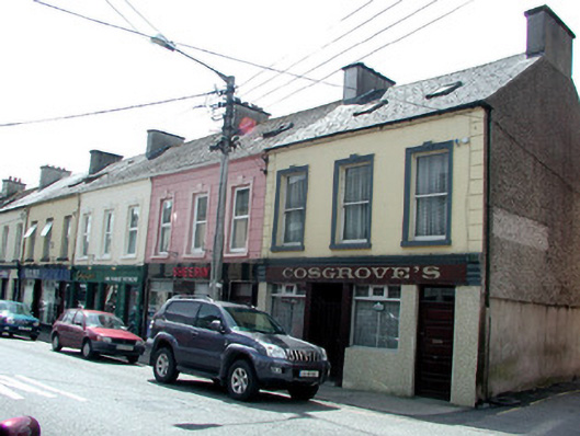 Terrace of three three-bay two-storey houses, built c.1860, with shopfronts and returns to rear. Pitched tiled roofs with rendered chimneystacks and skylights. Ruled-and-lined render to upper storeys, end-of-terrace house with stucco quoins. Timber shopfront to eastern house, vitrolite shopfront to central house, tiled shopfront with brackets to end-of-terrace. Stucco window surrounds with keystone and stone sills, timber sash windows and uPVC windows. Entrance doors within shopfronts.