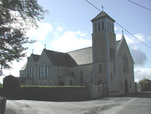Detached cruciform gable-fronted Roman Catholic church, built c.1880, with three-stage tower, transepts to three-bay nave with flanking side aisles and projecting apse. Abutting flat-roofed porches with parapet and projecting box bays to nave. Flat-roofed sacristy with parapet to north aisle. Pitched slate roof with cross finials, chimneystack to side of apse and cast-iron rainwater goods supported by projecting corbels. Pebbledashed walls with rendered plinth and stucco quoins with stucco and limestone string course to tower. Both stucco and tooled limestone chamfered window and door surrounds. Pointed- and shouldered-arched openings. Timber battened and panelled doors. Interior with open timber roof, nave and two side aisles. Stained glass windows and decorative plasterwork. Priests' graveyard located to north side of church. Church is situated on corner site with street-fronted front elevation. Bounded by random coursed limestone wall with entrance gates flanking front entrance. Ashlar limestone gate-piers with capping and cast-iron gates.