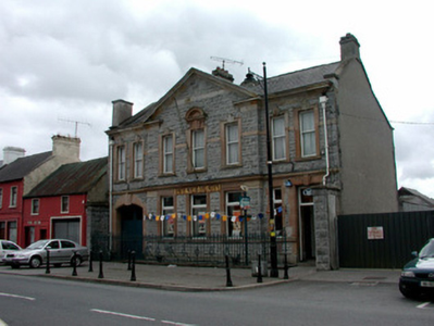 Detached seven-bay two-storey bank, built c.1880, abutting structure to east, with open-bed pedimented three-bay breakfront, integral carriage arch to east end and return to rear. Pitched slate roof with stone coping and rendered chimneystacks and cast-iron rainwater goods. Random coursed rock-faced limestone walls with sandstone cornice, string course and raised surrounds to openings with keystones to doorways and upper windows. Central window to upper storey surmounted by round-headed pediment. Windows are timber sash with replacement uPVC casements to ground floor. Timber panelled door with overlight and step. Timber battened double doors to segmental-headed integral carriage arch with sandstone voussoirs. Bank building is set back slightly from street and bounded by wrought-iron railings and gate.