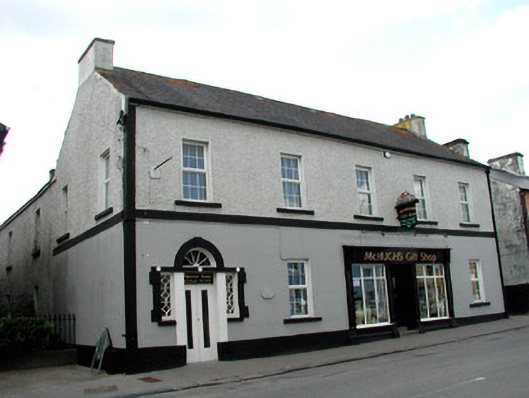 Detached five-bay two-storey house built, c.1830, with shopfront to ground floor and with rear return and outbuildings to rear of site. Pitched slate roof with rendered chimneystacks. Pebbledashed upper walls, rendered string course and plinth and smooth render to ground floor. Replacement uPVC windows with tooled stone sills. Glazed timber double doors with raised tooled stone surround with keystone flanked by traceried sidelights and surmounted by spoked fanlight. Timber shopfront with pilasters, fascia with raise lettering, timber and glazed double doors with overlight and stone threshold and flanked by display windows with replacement uPVC glazing. Outbuilding to rear with wrought-iron gate adjoining house to north. House fronts directly onto street.