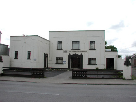 Detached L-plan three-bay two-storey ballroom, built in 1936, with single-storey bay to north and projecting two-bay single-storey wing to south, now used as a mushroom factory. Corrugated-iron barrel roof with plastic cover, hidden by parapet. Rendered walls with Art Deco Style detailing with date "AD. 1936" to parapet. Square-headed openings with replacement windows and stone sills. Door openings with replacement timber doors with stucco Art Deco stucco surrounds, accessed by concrete steps. Ballroom set back from road with rendered piers with stepped pyramidal capping to boundary wall, timber rails to street front.