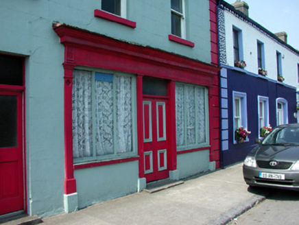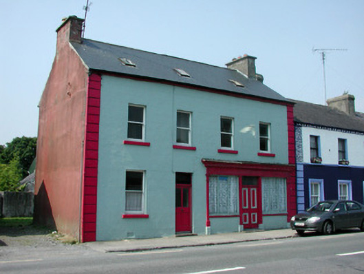End-of-terrace four-bay two-storey house with attic, built c.1850, with shopfront to ground floor, rear return and outbuilding to rear of site. Pitched slated roof with rendered chimneystacks, roof lights and cast-iron rainwater goods. Ruled-and-lined render to walls with quoins. Timber shopfront to ground floor with timber panelled double doors and overlight, flanked by display windows with rendered stall risers and with fascia and cornice. Timber panelled and glazed door with overlight to house. Timber battened door with overlight to rear return. Timber sash windows with stone sills. Stone outbuilding with pitched slate roof to rear of site. House fronts onto Bridge Street.