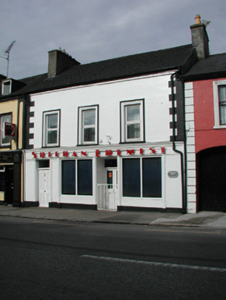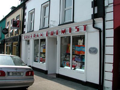 Terraced three-bay two-storey house, built c.1820, with shopfront of c. 1930 to ground floor, rear return and outbuildings to rear of site. Pitched slated roof with rendered chimneystacks. Ruled-and-lined render to walls with plinth course and stucco quoins. Timber panelled door with overlight to house flanked by timber fluted pilasters. Shopfront with recessed timber panelled and glazed double doors flanked by display windows with timber fluted pilasters with mounted wooden lettering to fascia board. Terrazzo threshold and shop floor with original glazed cabinets and shelving in situ to interior. Replacement uPVC windows to façade with stucco surrounds and with timber sash windows and timber battened door to rear. Rendered outbuildings to rear of site with corrugated-iron roofs.