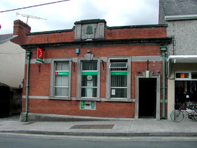 Detached four-bay single-storey post office, built 1911, abutting terrace to east and with multiple-bay brick-walled return with segmental-headed windows. Roof concealed by red brick parapet with carved stone coping and cast-iron rainwater goods. Red brick walls with limestone ashlar plinth, sill course, string course and cornice. Carved linestone plaque with metal harp and "Éire" emblem and date. Limestone letter box mounted in wall. Replacement windows set in carved limestone surrounds with stone sills. Keystone to central window. Timber panelled door set in carved limestone doorcase with keystone. Inscription to string course above entrance reads "Post Office". Building fronts onto street. Red brick gate piers to west with limestone plinths.