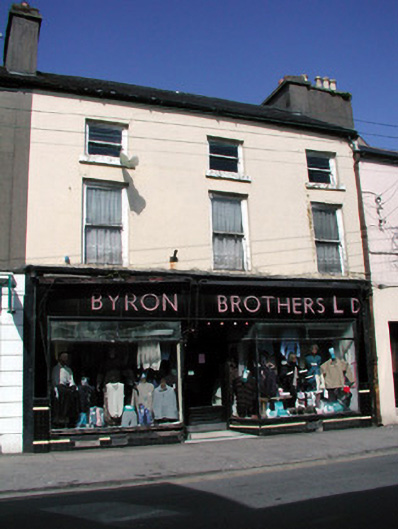 Byron Brothers, located within a terrace on Main Street, is a prominent three-storey structure. The vitrolite shopfront with central entrance is a notable feature and is complemented by a contemporary terrazzo threshold, signage and canopy. The timber sash windows, which vary in size, help to reinforce the classical proportions of the structure. The exposed sash boxes, which are a common feature in Castlerea, represent local joinery techniques.