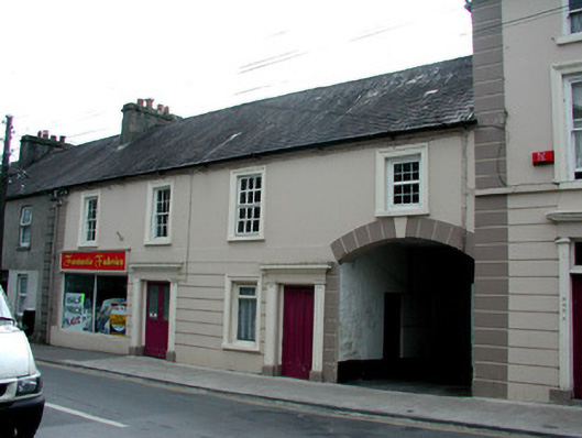Terraced four-bay two-storey house, built c.1820, now vacant, with shopfront to ground floor, integral carriage arch to south, return and range of outbuildings to rear. Pitched slate roof with rendered chimneystacks and cast-iron rainwater goods. Channelled render to ground floor and ruled-and-lined render to first floor with stucco quoins. Stucco surrounds to window openings with timber sash and replacement timber and uPVC windows and stone sills. Two entrances comprising timber panelled and glazed timber double doors flanked by stucco pilasters and surmounted by cornice. Segmental-headed carriage arch with stucco voussoirs and keystone. Two-storey random coursed stone outbuildings to rear. House fronts onto street.