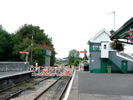 Complex of railway station structures, built c.1860 by Great Southern Railways as part of the Sligo-Westport line. Three-bay two-storey signal box with pitched slate roof and red brick chimneystack. Brick to ground floor with plinth and timber boarded and glass structure to first floor accessed by cast-iron steps. Segmental-headed timber frame windows. Timber station sign to signal box. Cast-iron signal posts to platform. Random coursed water tower with yellow brick opening and cast-iron water tank to top with ladder and measure. Wheel operated timber level crossing gates with cast-iron fittings to cut stone gate piers. Cast-iron lamps to gates.