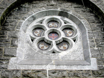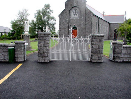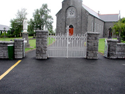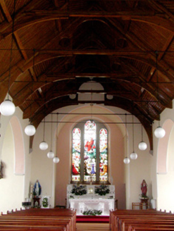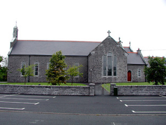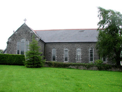 Detached cruciform gable-fronted Roman Catholic church, built in 1898 and renovated in 1997. Comprising six-bay nave, with chancel to north, sacristy to north-east with toilet block added to sacristy, c.1997. Pitched tiled roofs with replacement terracotta ridge cresting, cut stone and cast-iron finials. Stone coping to gables with bellcote containing date plaque to south-west end. Cast-iron rainwater goods with date '1898' to hopper at north-east corner. Repointed rock-faced random coursed limestone walls. Cut stone round-headed windows with stained-glass and relieving arches. Rose window and round-headed door opening set within round-arched recess of west front. Timber battened double doors with stained glass fanlights and tooled stone surrounds. Single-cell nave with open timber truss roof. Church bounded by concrete brick wall to front and east. Rock-faced cut stone gate piers and cast-iron gates to street. Church is set within its own grounds. Presbytery to north-east accessed through cast-iron gate.