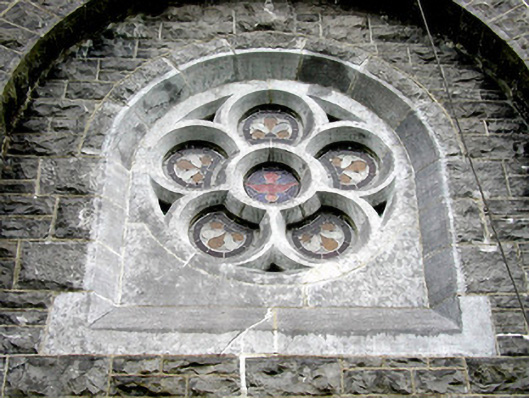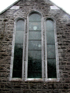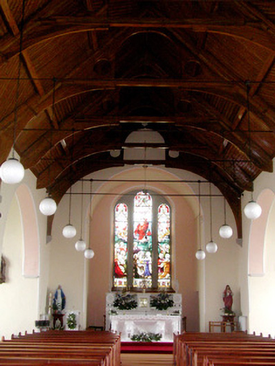 This fine church is located in the heart of Ballintober. The subtle embellishment of the stained glass windows and stone dressings enhance the limestone exterior, while the decorative hoppers adds an additional artistic quality. The collection of grave markers and statues contribute further to the setting of St. Bride's.