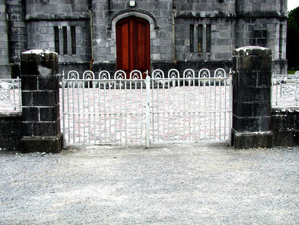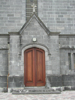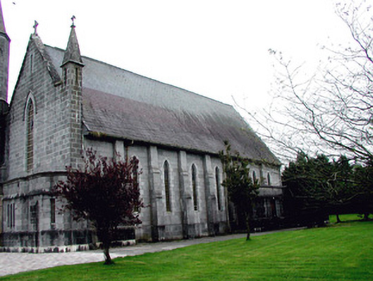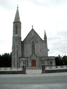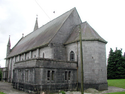 Detached gable-fronted Roman Catholic church, built c.1950, with projecting single-storey gable-fronted entrance porch to front flanked by three-stage tower to south-east. Seven-bay nave, canted apse to west and abutting single-storey sacristy to north-west. Pitched slate roof with pinnacle to gable front. Hipped slate roof to apse. Roofs to porch and sacristy set behind parapets. Punched cut limestone walls set to courses with buttresses. Tooled limestone plinth and string course. Ashlar limestone dressings to pointed-arched and square-headed windows with stained glass. Hood moulding to gable front. Four-centred doorway with cut stone surround and hood moulding to timber panelled doors. Tooled limestone plaque to south of entrance. Stone cross finials to gable front and porch. Church set back slightly from the road bounded by cast-iron railings on coursed plinth. Square-profiled gate piers with cast-iron gates.