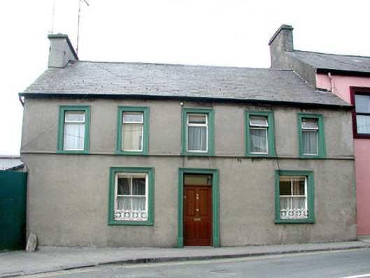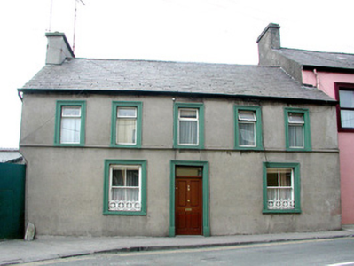 Detached multiple-bay two-storey house, built c.1840, abutting house to west. Pitched slate roof with rendered chimneystack. Ruled-and-lined rendered walls with continuous sill course and chamfered corner to east. Stucco window and door surrounds. Timber sash windows to ground floor with stone sills and cast-iron window guards. Replacement aluminium windows to first floor. Replacement timber panelled door and overlight. Limestone wheel guards to side of gateway leading to rear.