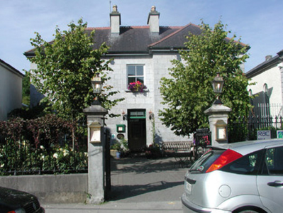 Detached three-bay two-storey former Presbyterian manse, built c.1860, now in use as a guest house and restaurant, with projecting bay to north and modern three-storey extension to rear. Hipped slate roof with terracotta ridge tiles and ridge cresting and rendered chimneystacks with terracotta pots. Coursed dressed limestone walls to front elevation with rendered walls to other elevations. Square-headed timber sash windows with cut stone surrounds and tooled stone sills. uPVC windows to rear extension. Timber panelled door with stained glass overlight and cut stone surround accessed by limestone step and threshold. Building is set back from road and is bounded by cast-iron railings on limestone plinth. Tooled limestone gate piers with cast-iron gate.