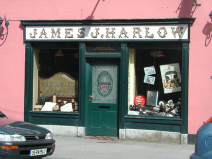 Pair of terraced three-bay three-storey houses, built c.1800, with shopfronts to ground floor and central integral carriage arch with single-storey return. Pitched slate and tiled roofs with rendered chimneystacks and cast-iron rainwater goods. Ruled-and-lined render to walls with continuous stone sill course to first floor windows and limestone plinths. Timber pilastered shopfronts with timber fascias and cornices. Round-headed openings with replacement timber doors and spider web fanlights. Timber and glazed doors to shopfronts with overlights. Segmental-headed integral carriage arch with timber battened double doors. Timber sash windows with stone sills. Terrace is street-fronted with southern house bounded by plinth wall surmounted by cast-iron railings.