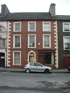Terraced three-bay three-storey house, built c.1800, with 1850s shopfront to ground floor and three-storey return to rear. Pitched slated roof with rendered chimneystack and stucco cornice to eaves. Ruled-and-lined rendered walls with stucco quoins and window surrounds. Timber sash windows with stone sills and with window guard to ground floor. Round-headed block-and-start doorcase with keystone, trancom and gothic style fanlight and with timber panelled door. Timber shopfront to south bay with timber panelled double doors and display window. Building is street-fronted.